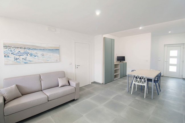 trilocale in muratura; piano terra o 1° piano; aria condizionata; angolo cottura; frigo; tv; 1 camera con letto matrimoniale; 2a camera con 2 letti singoli o letto matrimoniale; divano letto doppio in area giorno; bagno con doccia e bidet. Patio esterno attrezzato.
