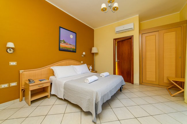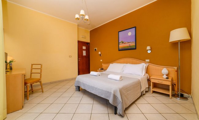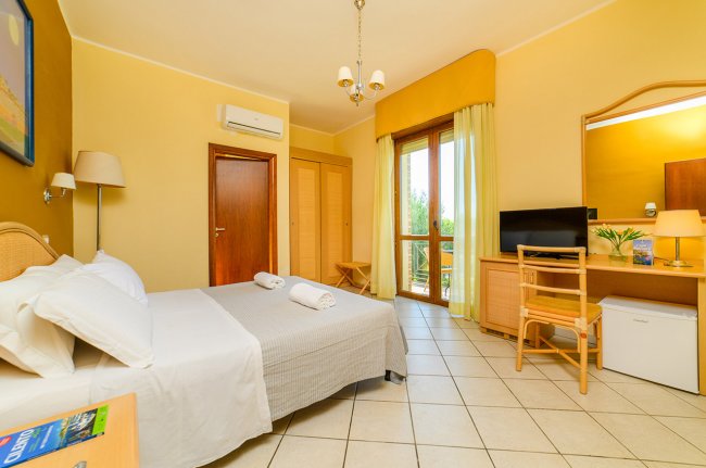 camera dal piano terra al 3° piano; aria condizionata; letto matrimoniale; tv-Sat; mini-frigo (eventuali consumazioni a pagamento); bagno con box doccia, bidet, asciugacapelli. 3° e 4° posto letto a castello. Balcone attrezzato con tavolo e sedie.