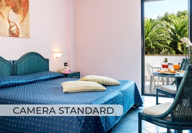 camera al piano terra, piano rialzato, 1° o 2° piano; letto matrimoniale; aria condizionata; tv; cassetta di sicurezza; minibar, con consumazioni su richiesta a pagamento; bagno con vasca o doccia e bidet; asciugacapelli. Eventuale 3° posto letto singolo. Area verde se al piano terra, balcone se ai piani attrezzato con tavolo e sedie.