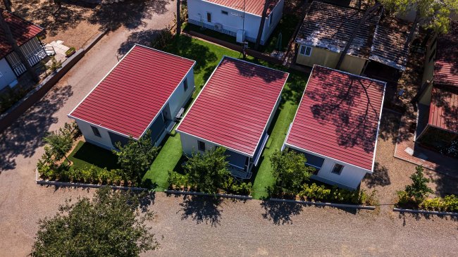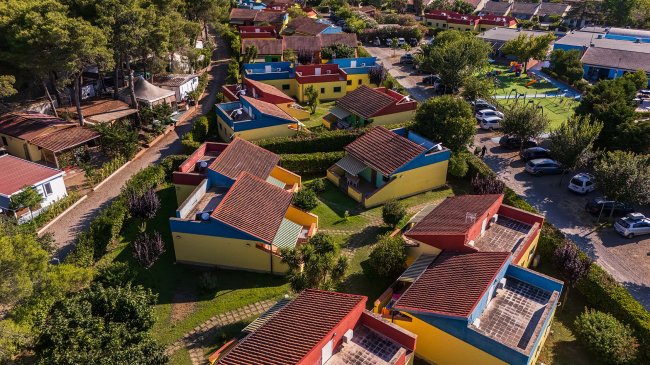 villino trilocale in muratura di 50 mq (+ 25 mq. di veranda esterna), piano terra; aria condizionata (facoltativa, a pagamento); area giorno con angolo cottura e frigo con freezer; cassaforte; tv; 1a camera con letto matrimoniale; 2a camera con letti singoli; divano letto doppio in area giorno; bagno con box doccia; bidet. Veranda esterna attrezzata con tavolo e sedie e giardinetto.