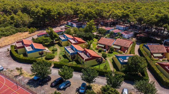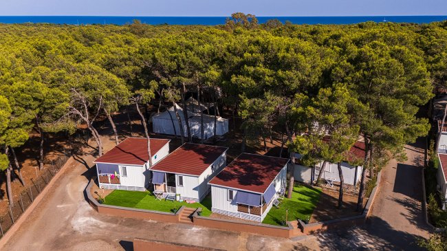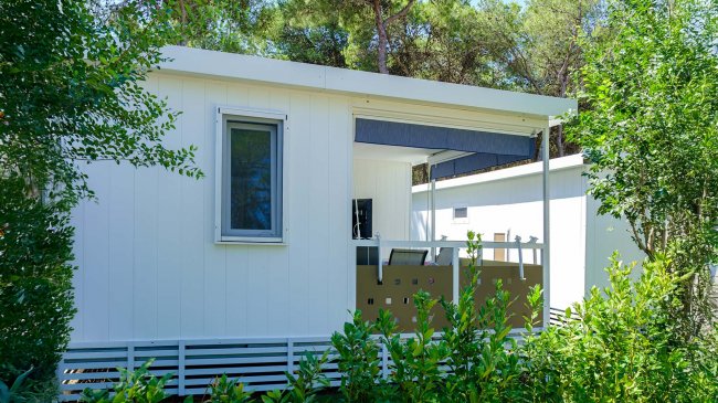 casa mobile trilocale, piano terra (presenza di n° 3 gradini per accedere alla veranda esterna); aria condizionata (facoltativa, a pagamento); area giorno con angolo cottura e frigo con freezer; tv; 1a camera con letto matrimoniale; 2a camera con letti singoli; bagno con box doccia; bidet. Veranda esterna attrezzata con tavolo e sedie.