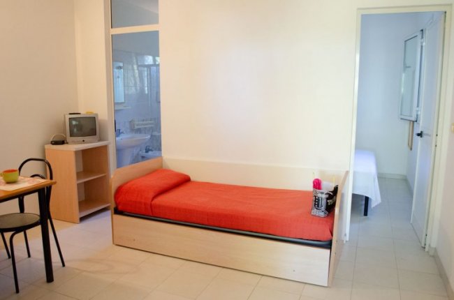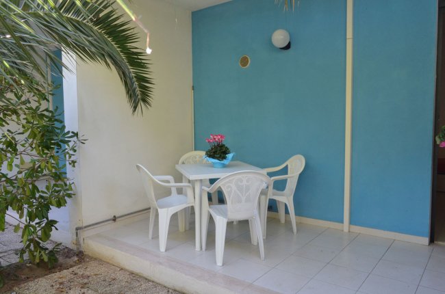 alloggio bilocale al piano terra; aria condizionata; area giorno con angolo cottura (NO pentolame) e frigo con scomparto congelatore; tv; 1 camera con letto matrimoniale; letti singoli (a scomparsa) in area giorno; bagno con box doccia. Verandina esterna arredata con tavolo e sedie e un piccolo giardino.